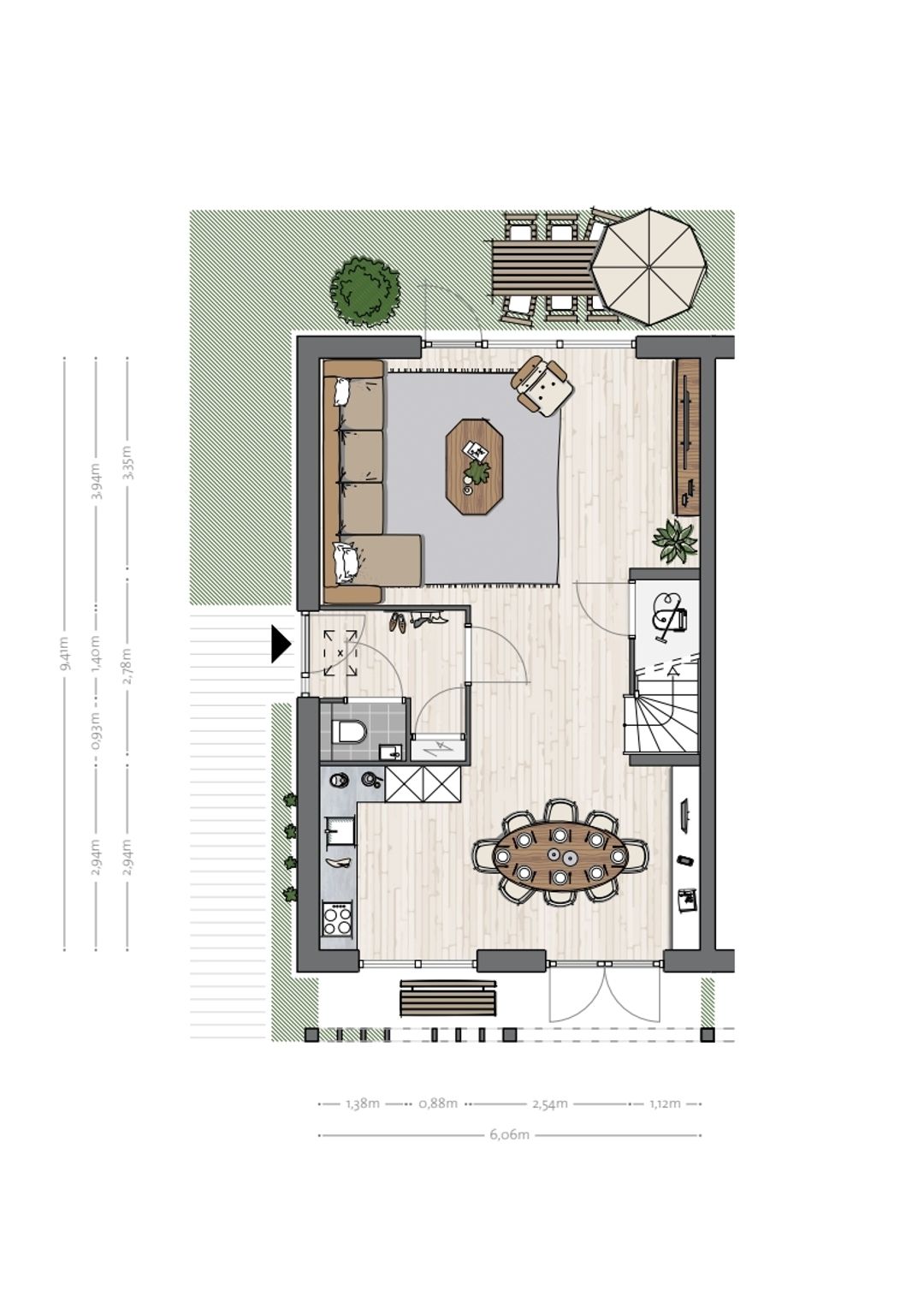 Via de entree aan de zijkant stap je binnen in de hal met toilet, meterkast en deur naar de woonkamer. Daar bereik je het open woongedeelte waar koken, eten en wonen gezellig met elkaar in verbinding staan. Ook vind je hier de trap naar boven. Aan de voorkant van de woonkamer is de keuken en aan de achterkant vind je de zithoek met riante raampartijen en de openslaande deur naar de tuin. Nog meer leefruimte creëren? Dat kan met een uitbouw richting de tuin of bij de entree, waardoor ruimte ontstaat voor een extra zithoek. Achter in de tuin is er een houten berging voor bijvoorbeeld de fietsen. De auto(‘s) parkeer je op 1 van de 2 privéparkeerplaatsen op eigen terrein, en toch mooi uit het zicht.